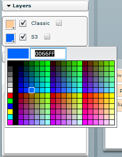 When clicking on the color of a layer a color palette appears. A new color can be selected from the color palette or a custom RGB Hex value can be entered into the input field.