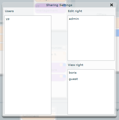 The sharing manager allows granting and revoking user’s view right or edit right to the current model. It is accessed from its link located in the options group on the sidebar menu.